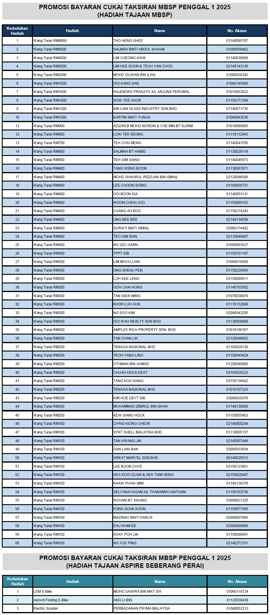 SENARAI PEMENANG PROMOSI BAYARAN CUKAI TAKSIRAN BAGI PENGGAL PERTAMA 2025 BAGI PEMBAYARAN SECARA ONLINE, MELALUI KIOSK DAN AGENSI KUTIPAN